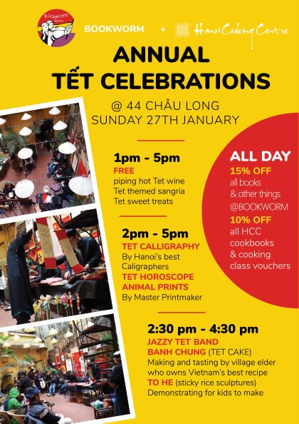 You are invited to our annual Tet celebrations at Bookworm & HCC, 44 Châu Long st, Ba Đình - Tel: 02437153711. There will be live Jazz Trio, free Tet drinks, free Tet cakes and...and 15% discount on all stock at Bookworm.