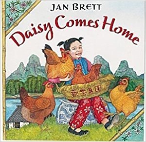 Picked on, pecked, and jostled, Daisy the hen is not quite as happy as her Happy Hens market basket might suggest. One evening, fed up with the other pushy hens, Daisy crawls into one of the baskets by the river, and falls asleep. Unaware of the rising river, this put-upon bird winds up floating downstream, past marauding monkeys, snorting water buffalo, and a greedy fisherman. Will Daisy ever make her way back to the home of the little girl Mei Mei and the six happiest hens in all of China? Breaking away from her usual Scandinavian illustrations and stories, Jan Brett embraces the beauty of China in this Story About Ping-inspired picture book. Bamboo poles frame the lavish illustrations of picturesque villages, strangely shaped mountains (Brett incorporates images of the animals into the ranges), and river-life characters. As in The Hat and her many other tales, Brett advances the plot with miniature border details.